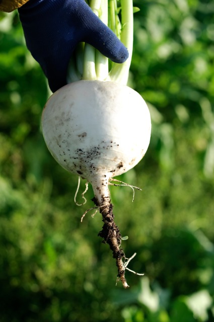 京都の伝統野菜の聖護院カブ(しょうごいんかぶ)は、他の品種に比べて大きく、ジューシーな肉質が特徴で、漬物にも適しています。