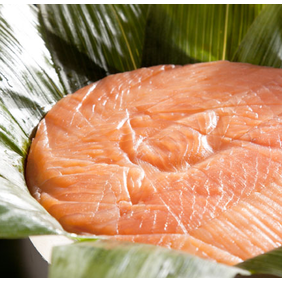 淡いさくら色の鱒、白光りするお米、色鮮やかな緑の天然笹がおりなす美しい彩り。