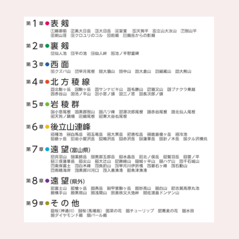 【81】富士山 【82】槍ヶ岳 【83】燕岳 【84】甲斐駒ヶ岳 【85】妙高山 【86】白山 【87】志賀高原丸池 【88】横手山 【89】黒斑山 【90】浅間山 【91】奥秩父大弛峠 【92】佐渡島ドンデン山