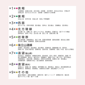 【57】呉羽山 【58】薬師岳 【59】黒部五郎岳 【60】水晶岳 【61】北ノ俣岳 【62】鷲羽岳 【63】雲ノ平 【64】三俣蓮華岳 【65】尖山 【66】大辻山 【67】鍬崎山 【68】城ヶ平山 【69】ハゲ山 【70】千石城山【71】南保富士 【72】白木峰 【73】負釣山 【74】早月川伊折橋 【75】碁石ヶ峰 【76】石動山 【77】雨晴海岸 【78】黒部川河口 【79】入善漁港 【80】魚津漁港